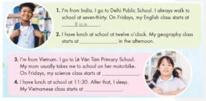 1. 🔊 I’m from India. I go to Delhi Public School. I always walk to school at seven-thirty. On Fridays, my English class starts at 8 a.m.
