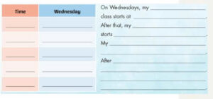 Look at E. Complete your timetable for Wednesday. Write about five classes.